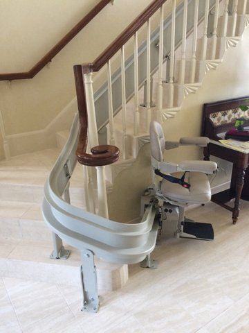 With curved rail stairlifts, it is possible and often preferable to bend the rail around the corner at the top or bottom. This accomplishes two goals: The lift is stored off of the stairs, and allows people more room to walk, and the stairlift user is able to get off and on to the lift further away from the edge of the stairs, which can be safer.