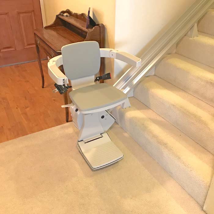 This Elan, model SRE-3050 was installed in a split level house, The customer decided that the stairs down to the living room were short enough for them to walk for now, but the long flight up to the bedroom was in need of a stairlift.