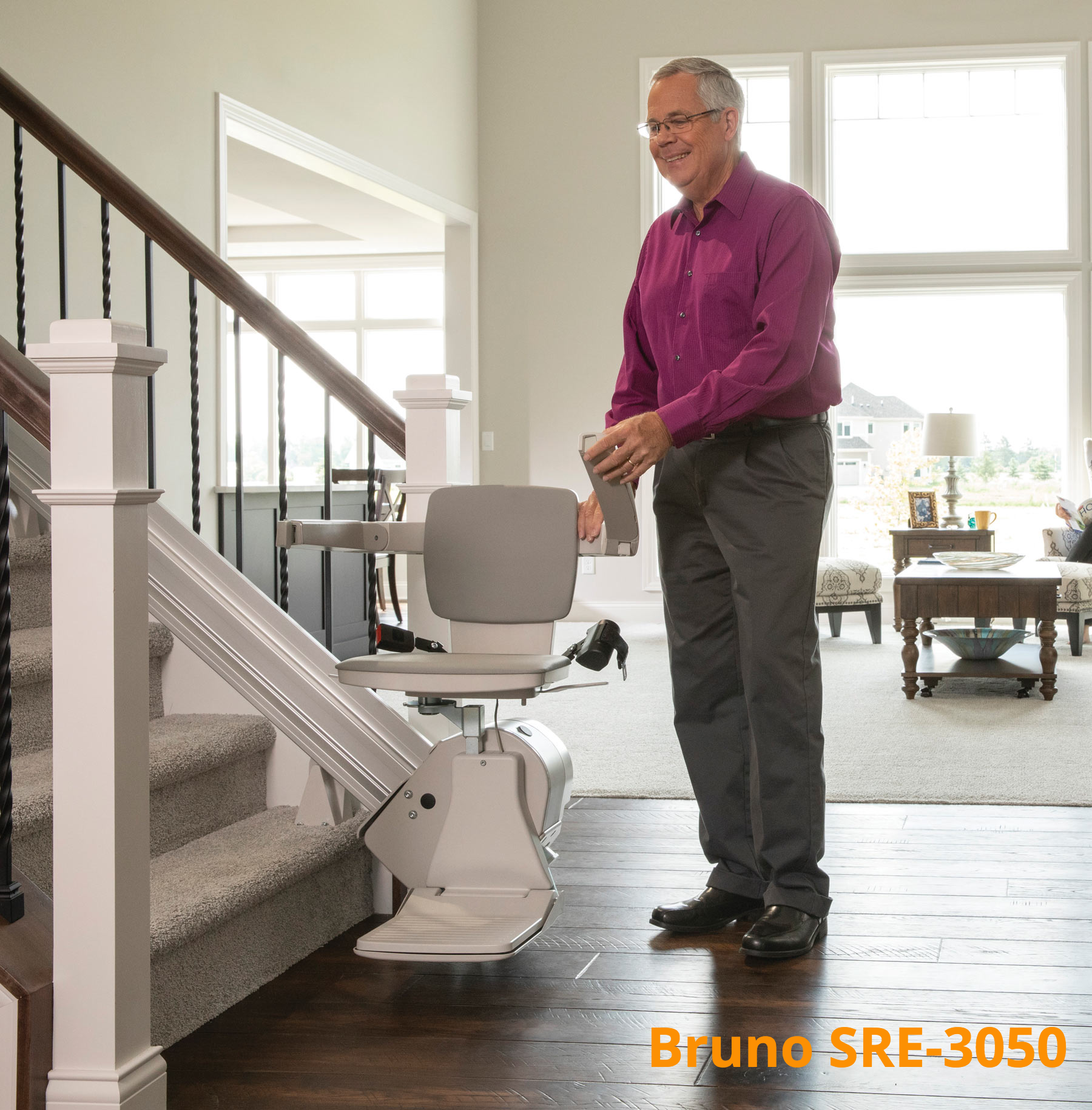 The SRE-2010 Elite is a very solidly built, comfortable straight rail stairlift. Our best. Smooth ride, comfortable seating. Choose a ball-bearing smooth manual swivel seat or powered swivel. Manual or power folding footrest. 400 pound capacity.