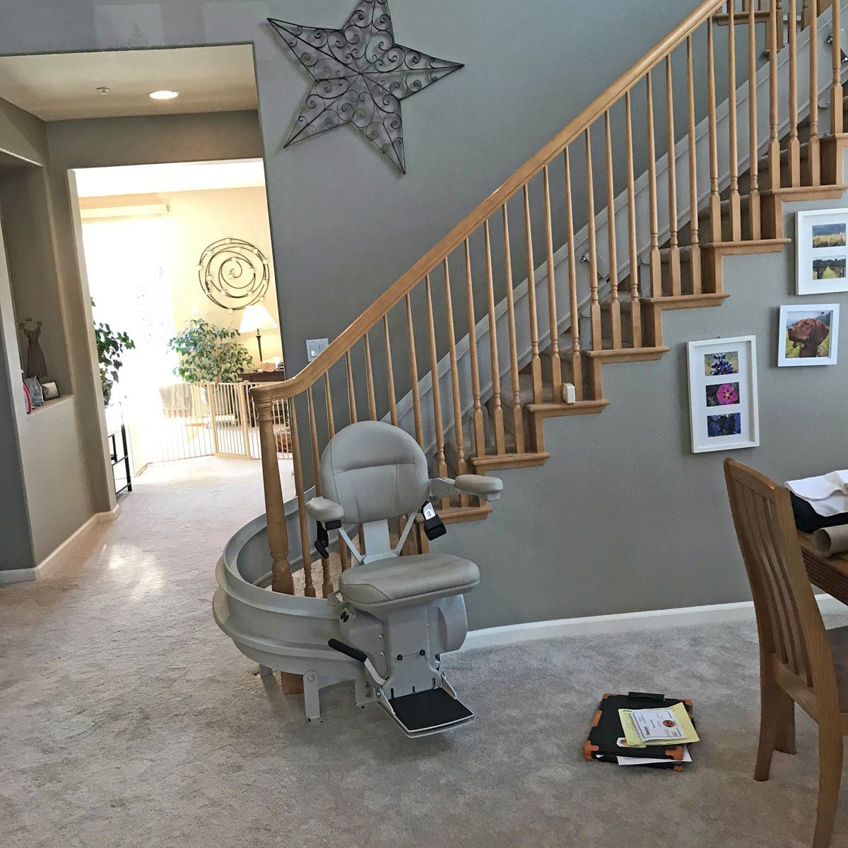 This staircase is pretty common in Napa. The entrance staircase in many homes in both Browns Valley as well as North Napa among all the "wine" named streets. Many choose a straight rail stairlift and make the single step up to the landing. This customer chose to install a custom curved rail lift that parked out of the way on this narrow staircase.