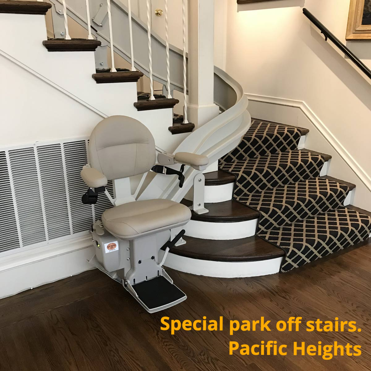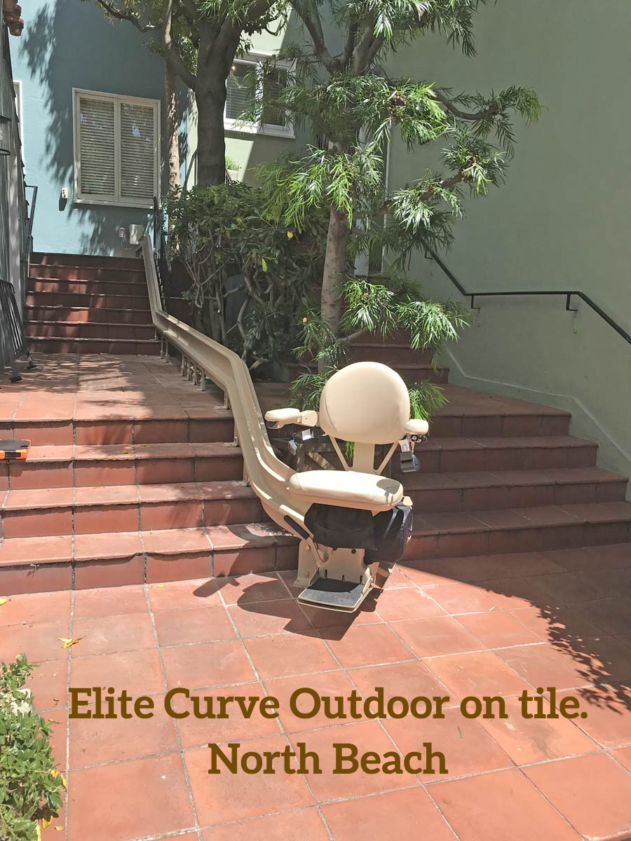This is one of two outdoor curved stairlifts needed to access this second floor unit in North Beach. Curved outdoor lifts can be fitted to some pretty irregular stairs. Tile, brick, concrete, stone, just to name a few of the substrates we attach outdoor stairlifts to. Our longest stairlift was 97 feet long with 11 bends!
