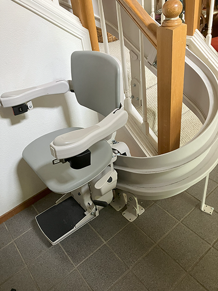 With curved rail stairlifts, it is possible and often preferable to bend the rail around the corner at the top or bottom. This accomplishes two goals: The lift is stored off of the stairs, and allows people more room to walk, and the stairlift user is able to get off and on to the lift further away from the edge of the stairs, which can be safer.